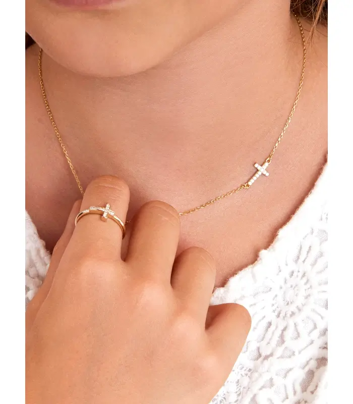 Anillo cruz. Plata de 1ª Ley baño en oro de 18k. Circonitas en microengaste. Talla adaptable.
