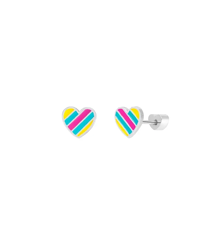 Pendiente corazón. Plata de 1ª Ley rodiada. Esmalte fucsia, amarillo y turquesa. Cierre rosca en forma de corazón.