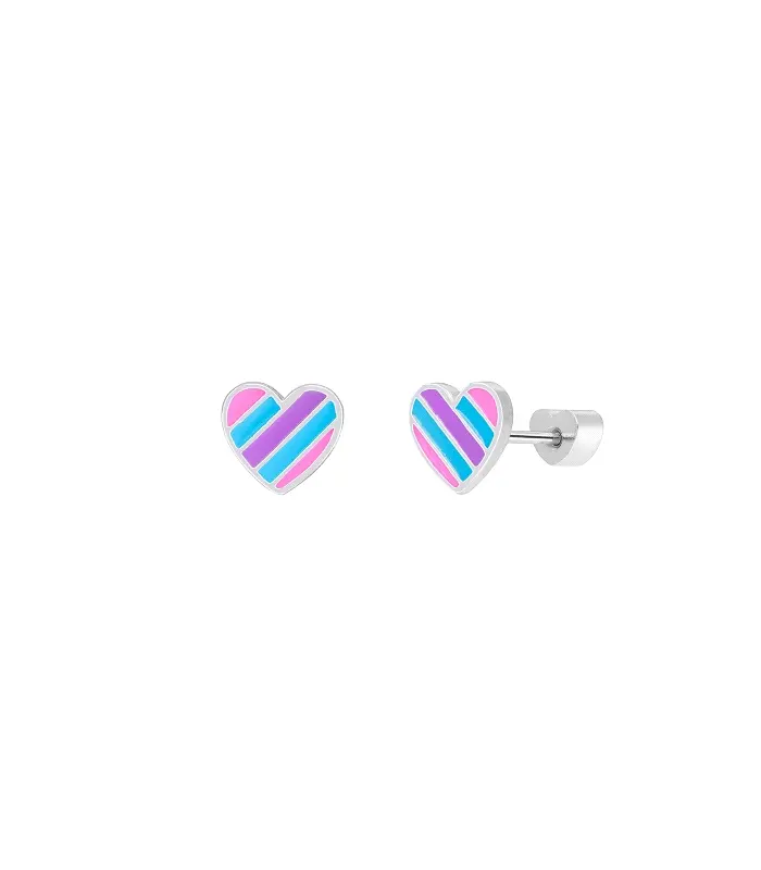 Pendiente corazón. Plata de 1ª Ley rodiada. Esmalte rosa, lila y turquesa. Cierre rosca en forma de corazón.