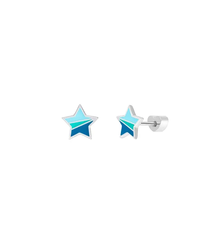 Pendiente estrella. Plata de 1ª Ley rodiada. Esmalte azul, turquesa y azul oscuro. Cierre rosca en forma de corazón.