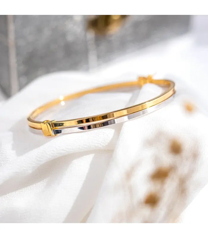 Pulsera rígida Oro 18k Brandi: Pulsera rígida fabricada en oro bicolor 18k de primera ley oval 67mm x 56mm
