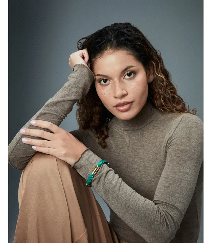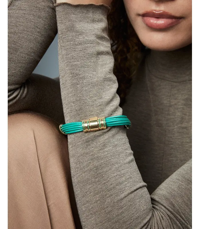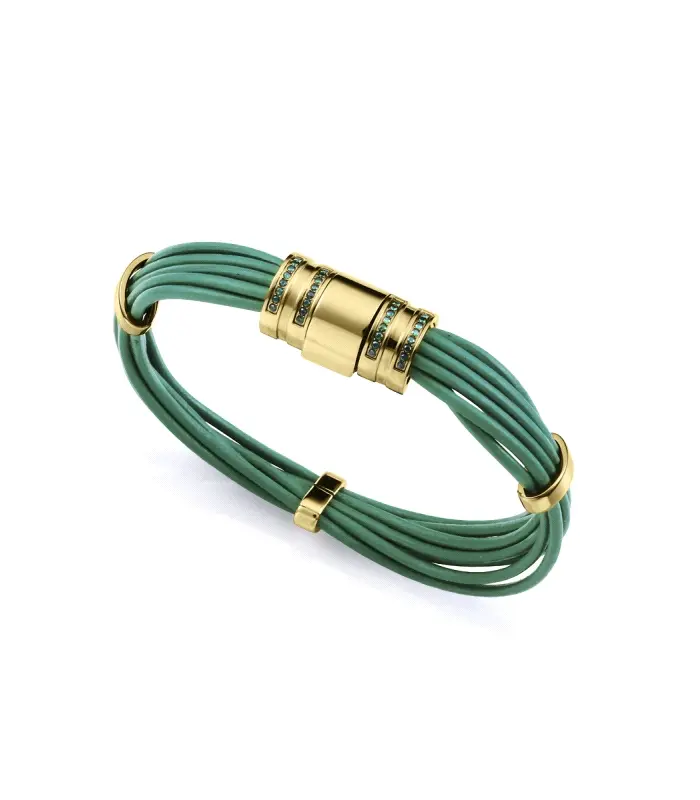 Una pulsera que combina frescura y sofisticación en un diseño único. Fabricada en acero con acabado IP dorado, esta pieza se realza con detalles de piel verde, aportando un toque de color vibrante y natural. Las circonitas verdes engastadas añaden un brillo delicado, complementando perfectamente el diseño con un toque de lujo. Con un largo de 20 cm, se ajusta cómodamente a la muñeca, convirtiéndola en una joya versátil y moderna. Ideal para mujeres que buscan un accesorio elegante y lleno de carácter, capazUna pulsera que combina frescura y sofisticación en u