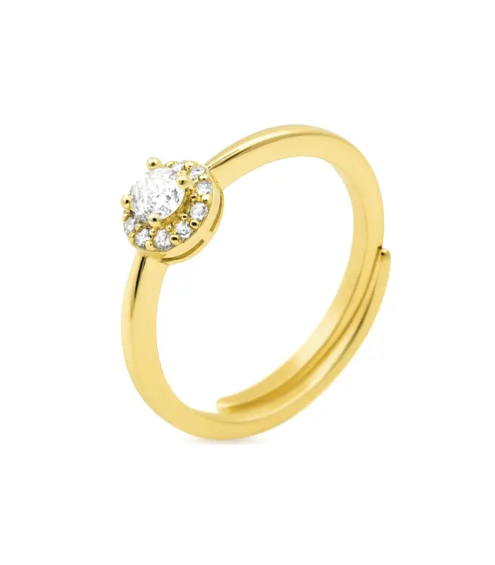 El anillo Aldra, elaborado en plata de ley con un acabado en oro amarillo, destaca por su diseño abierto que permite adaptarse a diferentes tamaños. Su elegante circonita central blanca se realza con un aro circundante formado por pequeñas circonitas que aportan brillo y sofisticación. Una pieza versátil y refinada, ideal para quienes buscan comodidad sin renunciar al estilo.