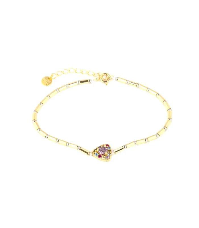 Descubra la elegancia de la pulsera Aldra, confeccionada en plata de ley con acabado en oro amarillo que aporta un toque cálido y sofisticado. Su diseño incluye circonitas multicolor que realzan la pieza con destellos vibrantes, centrando la atención en una piedra central morada que aporta distinción y profundidad. Con un largo ajustable de 16 cm más 3 cm de extensión, garantiza un ajuste perfecto para una comodidad y estilo excepcionales. Una joya versátil y refinada, ideal para realzar cualquier atuendo cDescubra la elegancia de la
