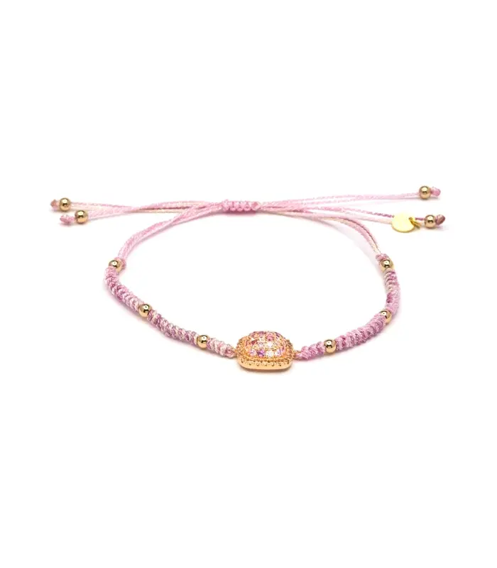 Esta pulsera Kerma está elaborada en plata de ley con un acabado en oro rosa que resalta su elegancia. Su diseño central presenta una piedra rosa rodeada de circonitas color champan que aportan brillo sutil y sofisticación. Dispone de un hilo ajustable que garantiza un calce perfecto y cómodo para cualquier tamaño de muñeca. Ideal para quienes buscan una joya versátil y refinada que combine calidad y estilo.