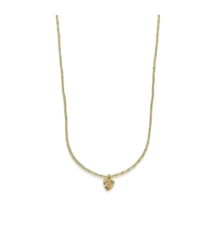 Este collar Aldra de plata de ley con acabado en oro amarillo destaca por su elegante colgante adornado con piedras multicolor, centrando la atención en una piedra principal color champán. Con una longitud de 42 cm y una extensión adicional de 3 cm, ofrece versatilidad para adaptarse a diferentes estilos y ocasiones, aportando un toque sofisticado y luminoso a cualquier conjunto.