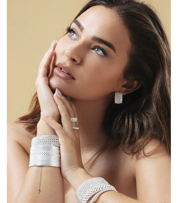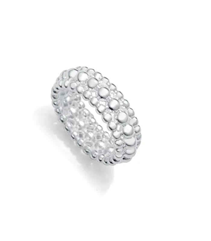 El anillo de acero ancho medio chapado en plata 999 de la colección de Laura Escanes que resalta por su originalidad y elegancia. Su estructura con bolas en relieve le da una textura única, convirtiéndolo en un accesorio sofisticado y versátil. Disponible en tallas 18, garantiza un ajuste perfecto y cómodo para la mujer que busca una joya exclusiva y atemporal.
