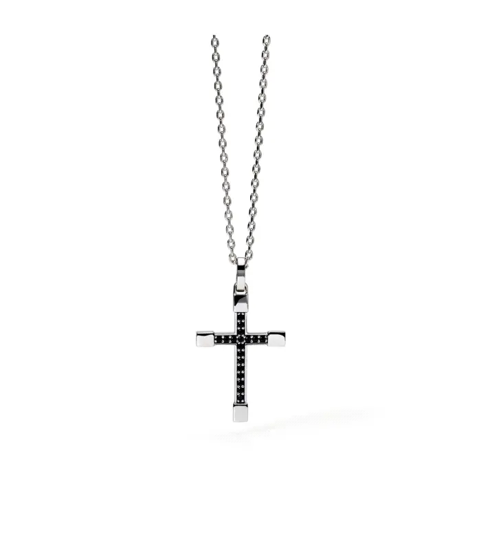 Collar de plata rodiada para hombre con cadena y colgante de cruz con circonitas negras. • Talla única, largo 50 cm • Dimensiones del colgante: 17 x 24 mm • Ancho de la cadena: 1 mm • Diámetro de la circonita: 1,25 mm • Cierre de mosquetón • Material: Plata 925, circonitas