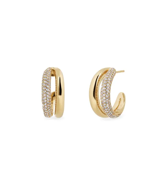 Pendientes semiluna dúo Allure bañados con una gruesa capa de oro macizo de 18 kt, lo que garantiza una mayor durabilidad. Engastados con circonitas blancas, cuya similitud con el diamante es casi indistinguible. Tienen una longitud de 21 mm y un cierre a presión.