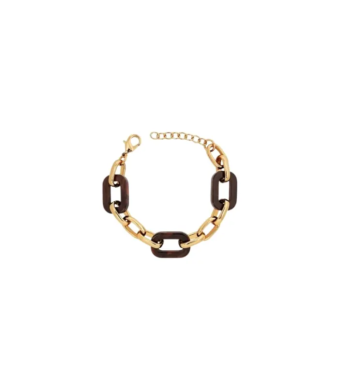 Pulsera Vidal&Vidal para mujer formada por eslabones en aleación de metales bañados en oro amarillo y 3 eslabones rectangulares en resina marrón. Su cierre es de mosquetón ajustable mediante cadena extensible.