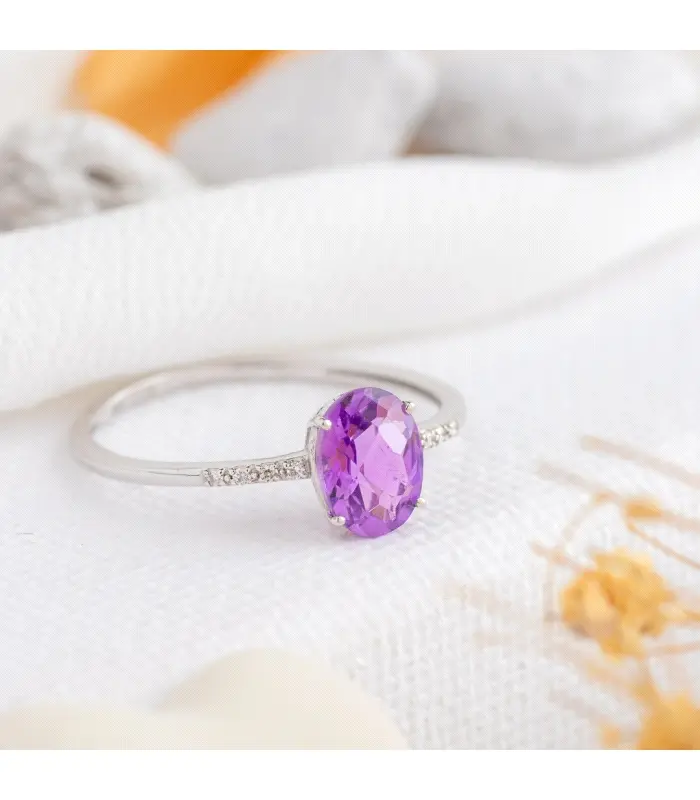 Anillo fabricado en Oro balcno de 18k con una amatista natural central talla oval de 7x5mm 0.72ct y 4 Diamantes en cada lateral con un total de 0.05ct
