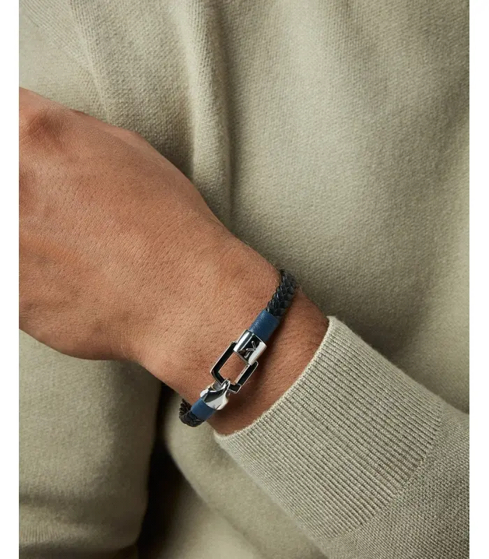 Pulsera de hombre de acero y piel trenzada negra con detalle piel azul
