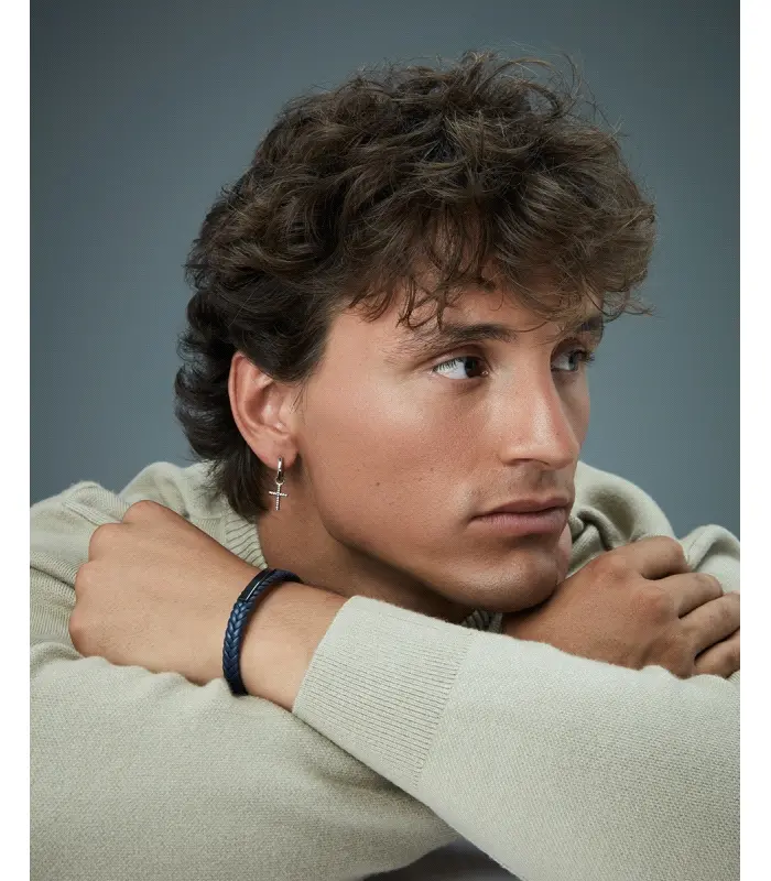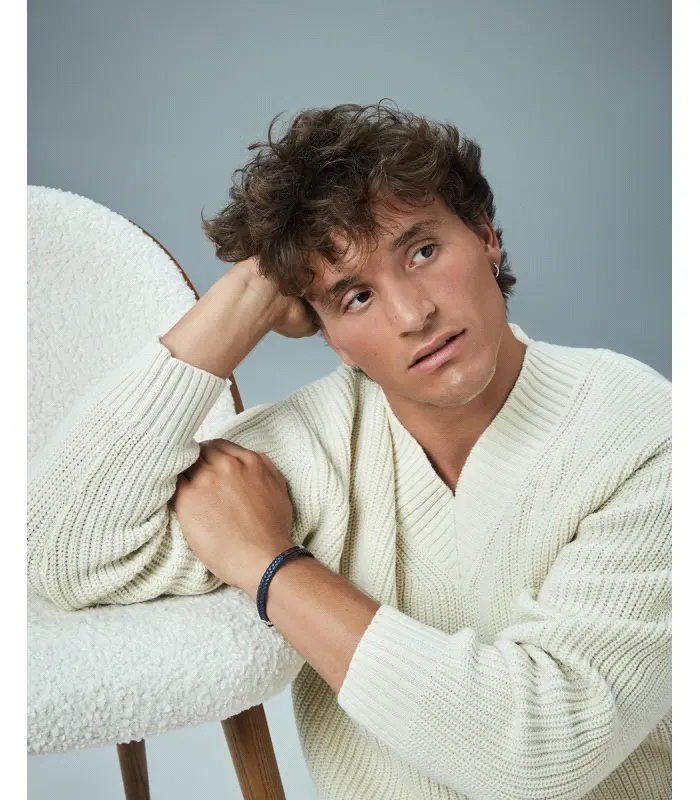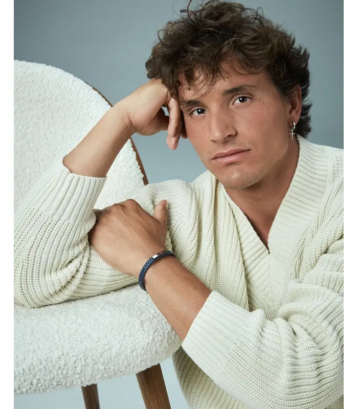 Pulsera de hombre de acero Ip gris con placa y piel trenzada azul.