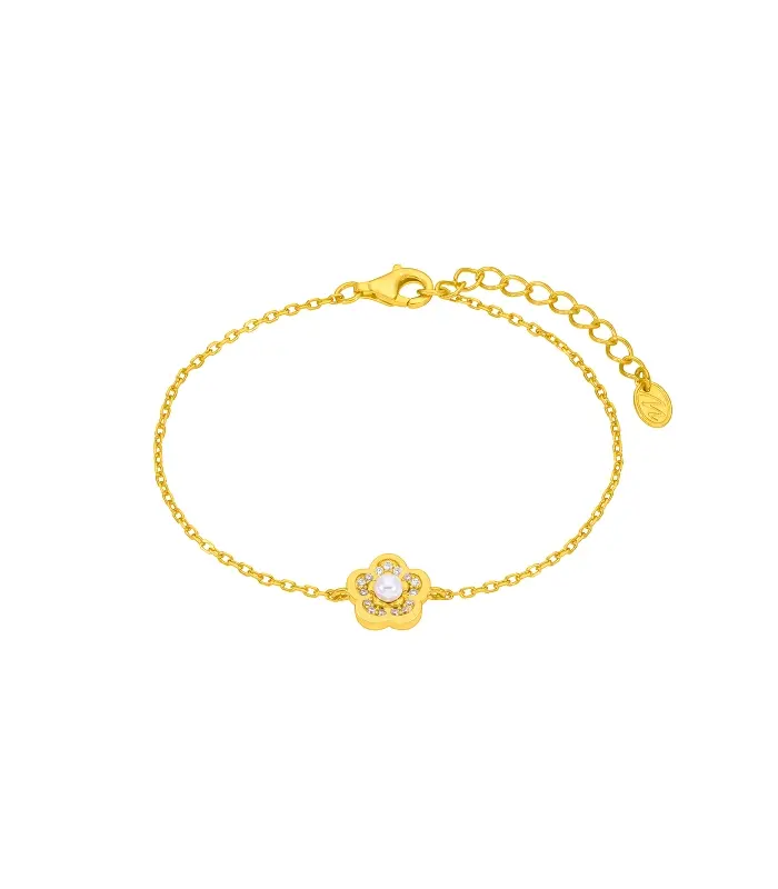 Pulsera flor perla. Plata de 1ª Ley baño en oro de 18k. Circonitas en microengaste. Cierre mosquetón. Cadena adaptable
