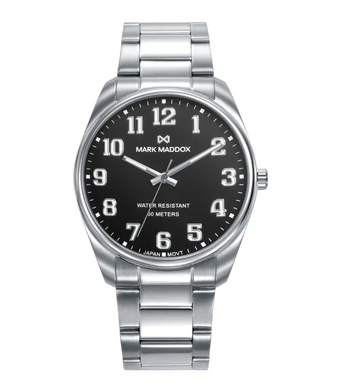 Con un diseño elegante y atemporal, este reloj de hombre combina una caja y brazalete de acero resistentes con una esfera negra de números árabes que facilita la lectura. Las agujas horarias en color plata y el cristal mineral aportan precisión y durabilidad, convirtiéndolo en un accesorio versátil que añade un toque de sofisticación a cualquier look.
